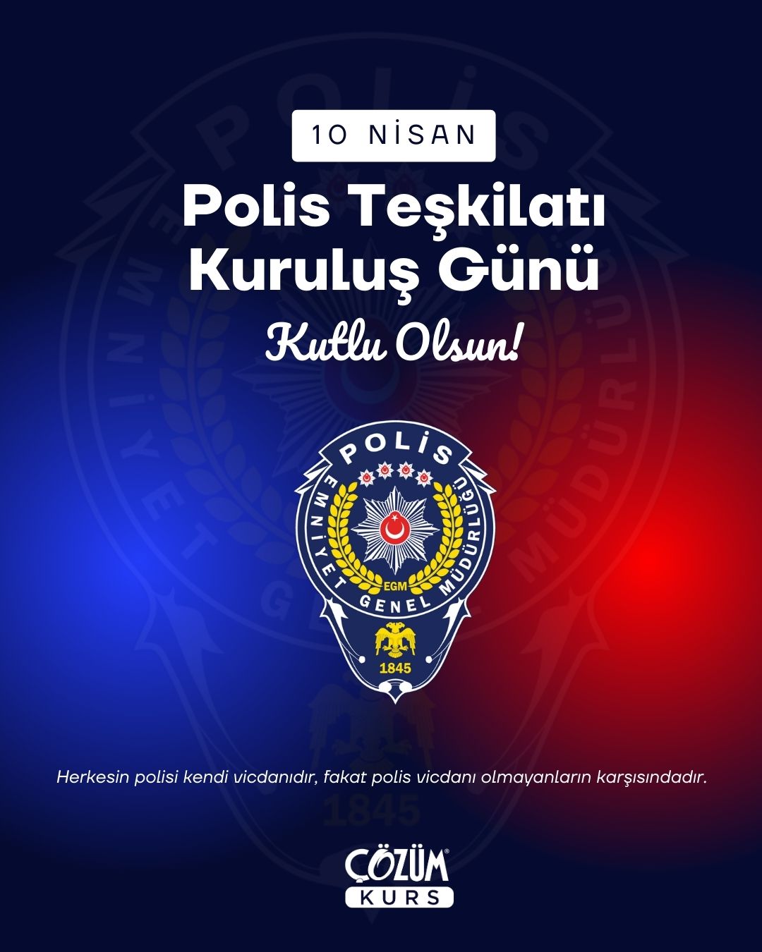 Milletimizin emniyetini sağlamak adına gece gündüz demeden emek veren ülkemiz için canı pahasına çalışan değerli polislerimizin bu özel gününü bir eğitim kurumu olarak kutluyoruz. 10 Nisan 1845 yılından bu güne huzur, güvenlik ve emniyetimiz için var olan Polis teşkilatları 7 gün 24 saat bizler için çalışarak Yüce Türk Milleti’ne hizmetini bugünde aynı enerji ile sürdürmektedir.