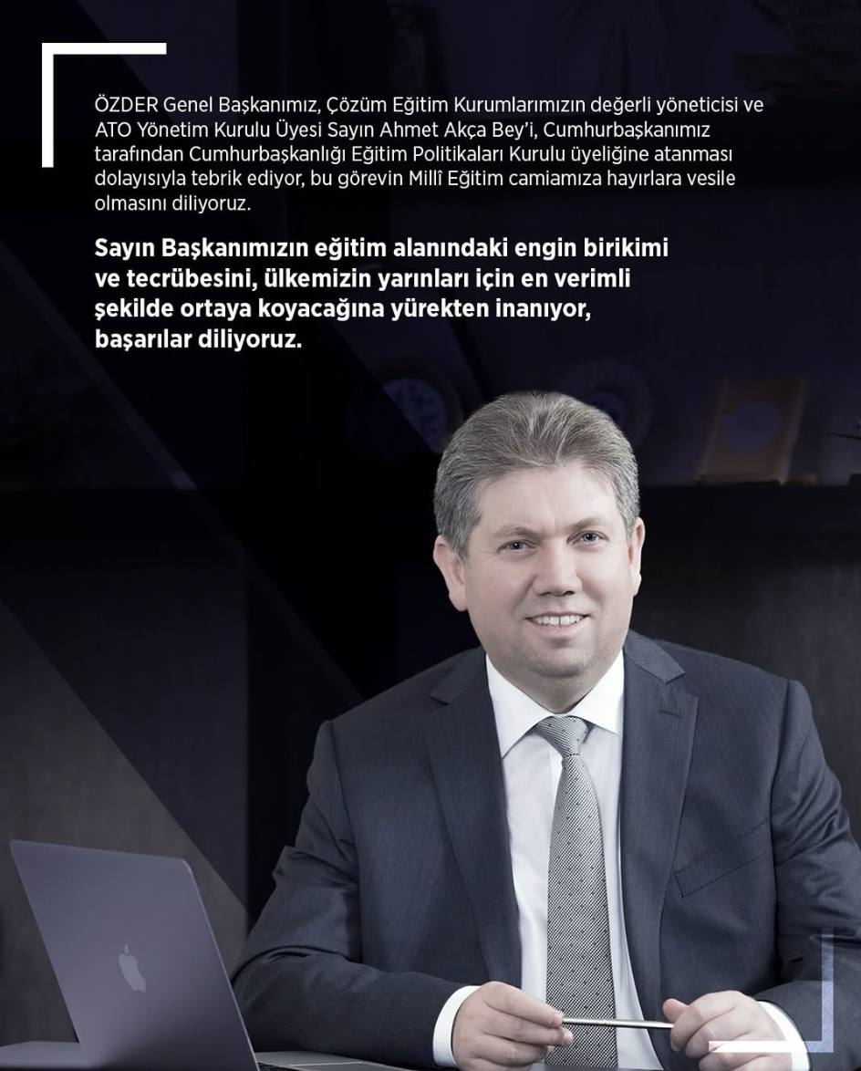 Ahmet AKÇA eğitim sektöründe Türkiye’nin yarınları olan öğrencilerin, başarılı, kültürlü ve iyi akademik bilgiye sahip bireyler olmaları adına Çözüm Eğitim Kurumları’na uzun yıllardır liderlik etmiştir. Sektörde daima saygınlığını koruyan, derin tecrübesi ve bilgisiyle her daim fikrine başvurulan Sn. Akça’nın aldığı bu görev tüm eğitim camiasında heyecan ve memnuniyet uyandırdı.