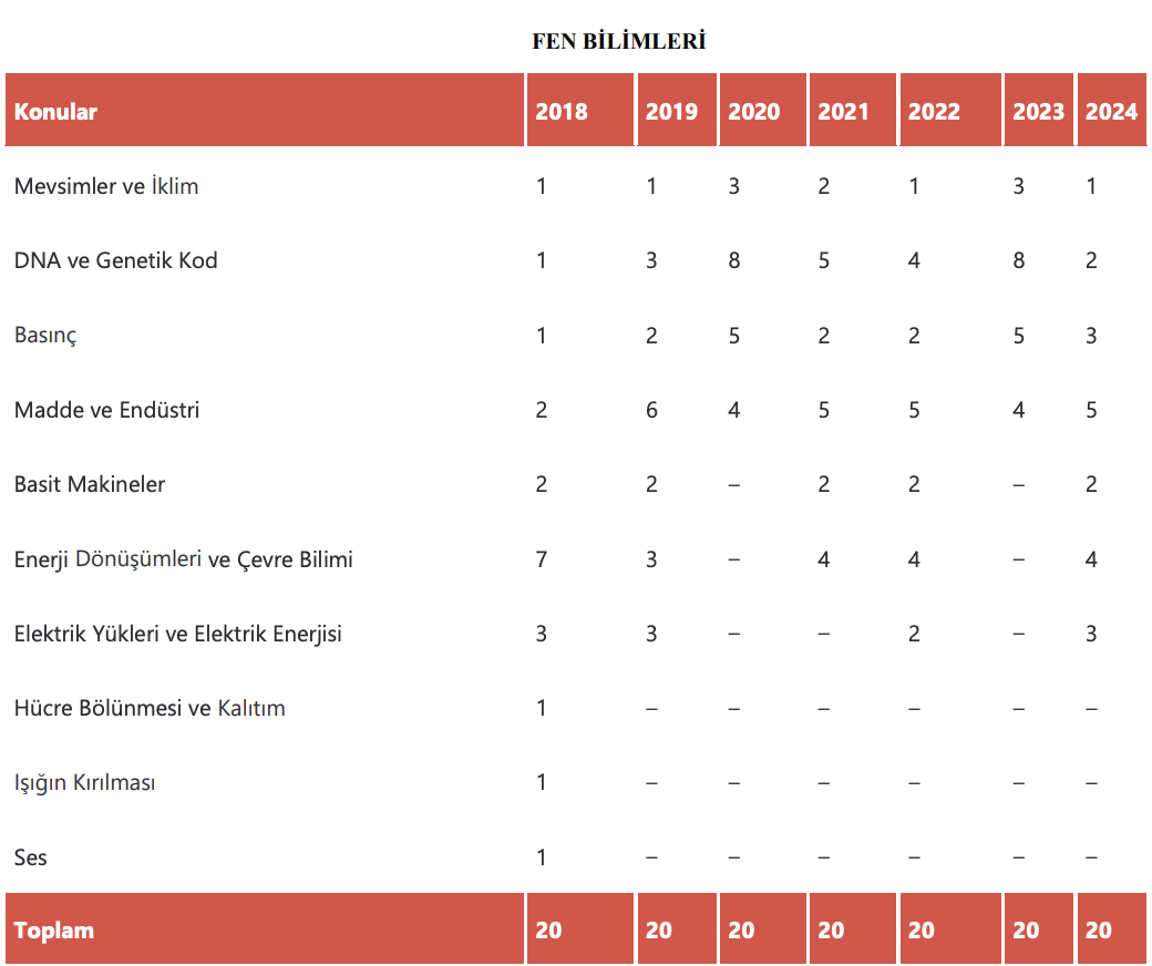 Fen bilimleri dersinden en çok hangi konudan soru çıkmış 2025 yılına kadar ki süreçte sizler için hazırladık. Lgs fen sınavda çıkan konular hangileri sorusunu da yanıtlayacak olan bu makale 2018 ile 2024 yılları arasında lgs de fenden çıkmış soru sayılarını konulara göre soru dağılımlarını bulabileceğiniz bilgiyi sunmaktadır. (kaynak)