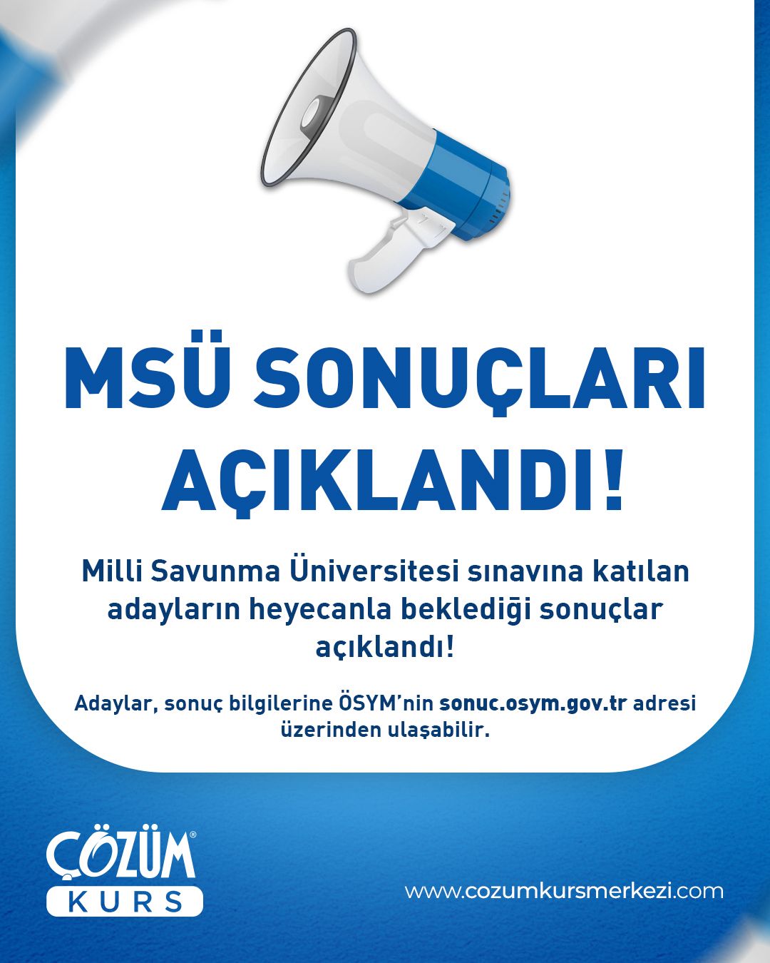 Sınav sonuçlarını görüntülemek için : https://sonuc.osym.gov.tr/Sorgu.aspx?SonucID=10260 adresini ziyaret etmeniz yeterli olacaktır. Türkiye’nin en iyi dershanesi ÇÖZÜM KURSLAR MSÜ’de de kazandırdı! MSÜ dereceleri ile ÇÖZÜM yine adından söz ettirmeyi başarmıştır.